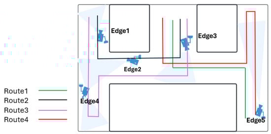 The experiments were conducted using a self-collected dataset comprising footage from five strategically positioned cameras, as outlined in Table 1a,b. These cameras were installed at key locations within the experimental environment, to ensure optimal coverage of the target object as it navigated through multiple predefined routes. Figure 6 illustrates the layout of these routes and the placement of the cameras, which were designed to simulate realistic scenarios involving various behavioral patterns.