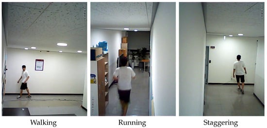 Each route in the dataset was specifically designed to encompass three types of target behaviors: walking, running, and staggering. The walking behavior represented a consistent and steady movement, reflecting the most common and predictable gait pattern observed in pedestrian monitoring. The running behavior involved rapid movement, which presented a greater challenge for accurate tracking, due to increased speed and shorter intervals between camera transitions. The staggering behavior introduced irregular and unpredictable movement patterns, characterized by abrupt changes in direction and unstable trajectories, further testing the system’s robustness. These three behaviors were selected based on their relevance to real-world surveillance applications. Walking is frequently analyzed in pedestrian tracking, while running is often associated with suspicious activities, emergency responses, or law enforcement scenarios, making it a crucial behavior for monitoring systems. Staggering is particularly significant in health monitoring, anomaly detection, and security surveillance, where identifying erratic behavior can be essential for intervention. By incorporating these distinct movement patterns, the TEDDY framework was evaluated across diverse tracking conditions, demonstrating its adaptability to various real-world scenarios. The dataset included a comprehensive collection of frames for each route and behavior type, providing sufficient diversity for experimental analysis. The detailed frame counts for each route and behavior type are presented in Table 1b. Additionally, Figure 7 showcases illustrative examples of each behavior type along the various routes, offering visual insight into the complexity and variety of the scenarios captured in the dataset. This well-structured and diverse dataset forms the basis for evaluating the performance of the TEDDY framework in dynamic and challenging environments.