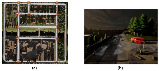 The scenario used in Experiment 2 was an urban environment in which an emergency vehicle drove along with other vehicles. In Experiment 2, the TEDDY framework targeted the emergency vehicle for tracking. The experimental environment was set up in Unreal Engine using CARLA [35], which is widely used in research to simulate environments similar to the real world. The environment consisted of a rectangular urban area with various vehicles driving while following traffic signals. The CARLA 4.26 Python application programming interface (API) was used to create this environment. A total of 12 closed-circuit televisions (CCTVs) were set up in the experimental environment and placed at locations where vehicles within the environment might change direction. Figure 8a shows the simulation environment viewed from above, and (b) depicts a scene with the emergency vehicle navigating through the actual simulation setting.