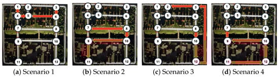 Each scenario route included a total of five cameras. The emergency vehicle started at the location of the first numbered camera in each scenario: (a) Scenario 1 followed the route 1-4-5-6-3; (b) Scenario 2 followed 7-8-10-9-11; (c) Scenario 3 followed 8-10-12-3-2; and (d) Scenario 4 followed 11-12-10-9-7.