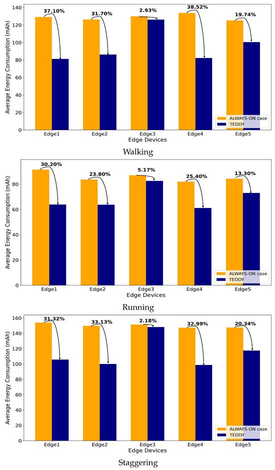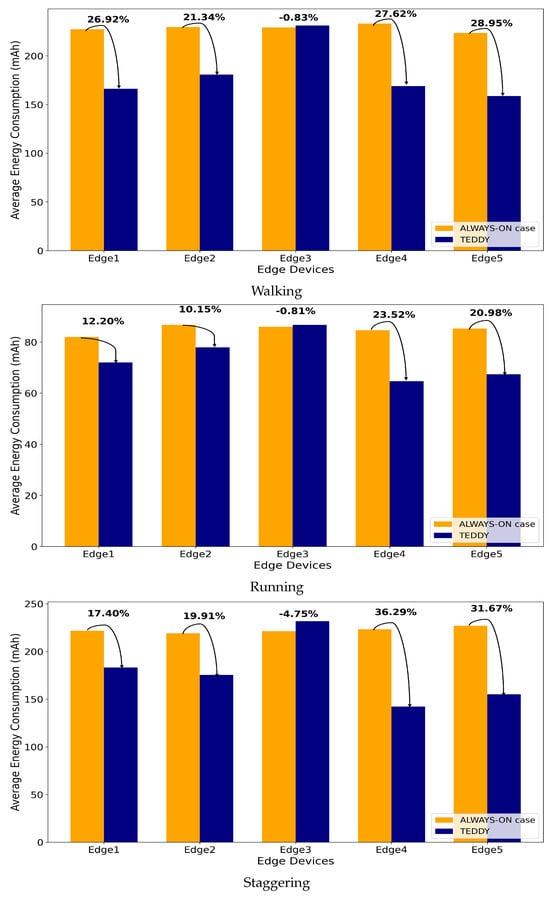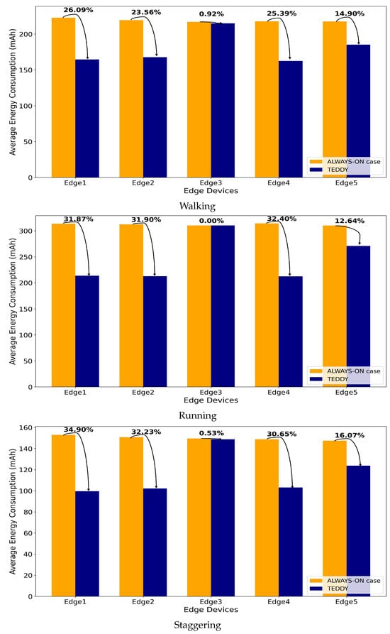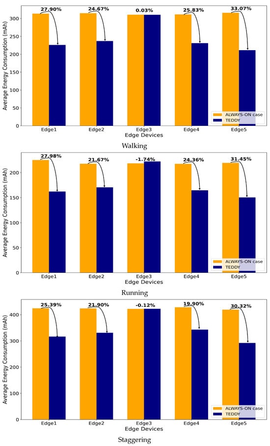 The experimental results shown in Figure 10, Figure 11, Figure 12 and Figure 13 provide a detailed analysis of power consumption and efficiency across various routes and behavior types. The results clearly demonstrate that the TEDDY framework significantly reduces energy usage compared to the traditional method, where all cameras remain continuously active. Specifically, the TEDDY framework achieved a 20.96% reduction in power consumption, highlighting the effectiveness of its dynamic camera selection mechanism. This reduction was a direct result of the framework’s ability to deactivate unnecessary cameras and ensure that only the cameras relevant to the target’s trajectory remained active, thus enhancing overall resource efficiency. To further evaluate consistency, we performed ten repeated trials for each route and behavior type, measuring the power consumption (in mAh) of each edge device. Table 2 presents the means and standard deviations of these trials for Routes 1–4 with the TEDDY framework activated. Each group corresponded to a set of scenarios covering different movement behaviors (walking, running, and staggering). The average indicates the typical power draw under each condition, whereas the standard deviation quantifies how consistently the system performed across repeated runs. Lower standard deviations suggest more stable energy usage, whereas higher values indicate greater variability.