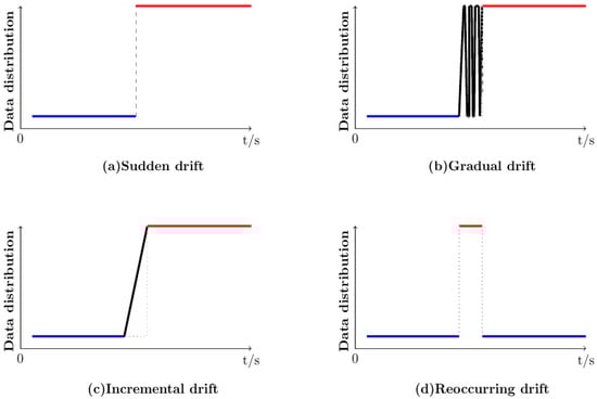 Concept drift can be roughly classified into four types based on different drift characteristics [15]: sudden drift, gradual drift, incremental drift, and reoccurring drift, as illustrated in Figure 1 (The blue line represents the distribution of the old concept to which the data belongs, the red line indicates the distribution of the new concept, and the black line depicts the transition from the old concept distribution to the new concept distribution). Relevant studies typically focus on detecting some or all of these drift types. For instance, the Active Drift Detection based on Meta learning (Meta-ADD) [16] detects sudden, gradual, and incremental drifts. The LSTM Drift Detector (LSTMDD) [17] is designed to detect sudden and gradual drifts. The Weakly Supervised Conceptual Drift Detection method based on the Online Deep Neural Network (WSCDD) [18] is capable of detecting all four types of concept drift.