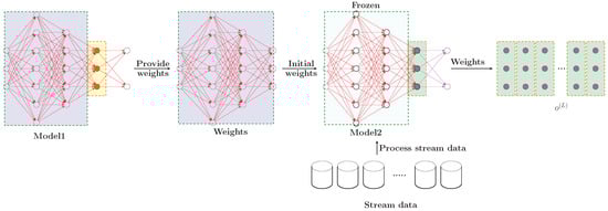 The data stream processing flow is shown in Figure 4, and the algorithm is detailed in Algorithm 3. Model2 uses the same network structure as Model1. The difference lies in the model initialization, which is carried out as follows: the connection weights and biases, , of all the hidden neurons in the trained Model1 are copied to Model2, and the parameters (highlighted in the blue box in Figure 4) of all hidden layers, except for the last hidden layer, are frozen (see step 2 in Algorithm 2).This approach is based on the following considerations: first, neural networks have feature representation capabilities, and using pretrained model weights helps reduce the time required for retraining. Secondly, assuming that the hidden layer parameters of the trained model can represent data belonging to the old concept distribution, we copy and freeze the connection weights and biases of the earlier hidden layers to assist the model in recognizing data from the old concept distribution in the data stream. The last hidden layer is kept in an updatable state, allowing the model to adjust its parameters promptly when new concept distributions emerge in the data stream.