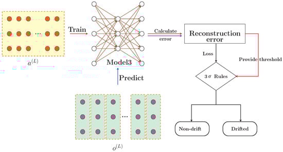 When the final hidden layer output (deep pink neuron—green box) from Model2 is received, it is used as test data to compute the reconstruction error (refer to the blue arrow in Figure 5). This error is then compared with the threshold limits derived from the 3 principle. Data points whose errors fall outside the threshold range are classified as drift data (refer to lines 11–16 of Algorithm 4). The reason for selecting the final hidden layer outputs of the model as both training and test data is as follows: Model2, initialized by copying and freezing the connection weights from Model1, is capable of distinguishing between data belonging to old and new concepts. Consequently, the model’s performance varies for data associated with different concepts, which is reflected in the model’s predictions. Since the weights in the model are influenced by error backpropagation during training, we reason that the output of the final hidden layer, being closest to the model’s prediction, will also manifest this distinction. Therefore, in both Model1 and Model2, we collect the outputs of the final hidden layer and use them separately as training and test data.