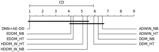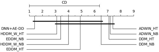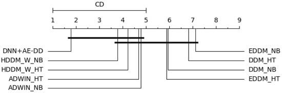 In Figure 10, the computed value of is 3.28. When and , follows an F-distribution with degrees of freedom (8, 40), with a critical value of 2.18. This result leads to the rejection of the null hypothesis that “all algorithms perform equally”. At a confidence level of , the critical value is 2.724, yielding a critical difference () value of 4.31. As illustrated in the figure, the proposed algorithm demonstrates significantly better performance in terms of delay detection compared to the DDM_NB, DDM_HT, ADWIN_NB, and ADWIN_HT.