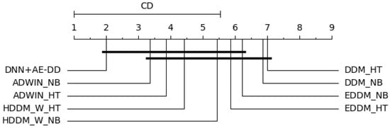In Figure 11, the computed value of is 6.62. When and , follows an F-distribution with degrees of freedom (8,32), with a critical value of 2.244. This result also leads to the rejection of the null hypothesis that “all algorithms perform equally”. At a confidence level of , the critical value is 2.724, yielding a value of 4.72. As shown in the figure, the proposed algorithm significantly outperforms the DDM_HT, ADWIN_NB, and ADWIN_HT in terms of the effective detection range.
