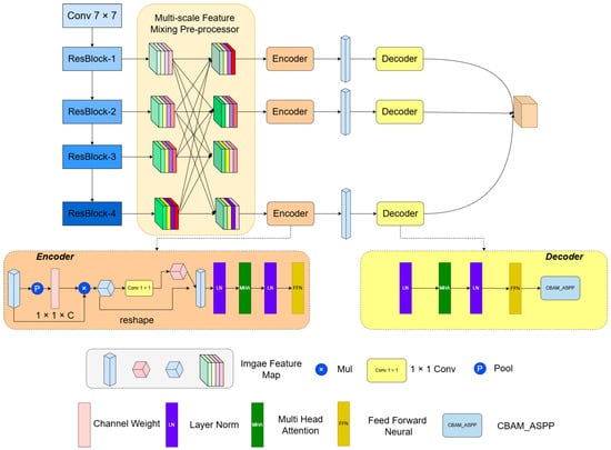 As depicted in Figure 1, the proposed model comprises three principal components: a Multi-Scale Mixed Preprocessor, a Cross-Channel Spatial Encoder, and a Multi-Scale Spatial Decoder. In the context of agricultural land change detection, the Multi-Scale Mixed Preprocessor extracts local features across multiple scales, thereby enhancing sensitivity to changes. The Cross-Channel Spatial Encoder integrates features from various channels, employing a self-attention mechanism to prioritize critical change areas. Finally, the Multi-Scale Spatial Decoder maps the encoded features back to spatial dimensions, yielding precise change detection outcomes. This structural integration markedly enhances the model’s performance and accuracy in agricultural land change detection.