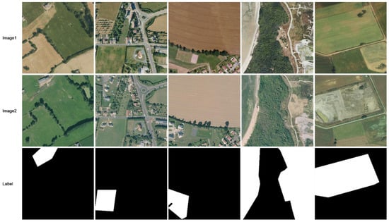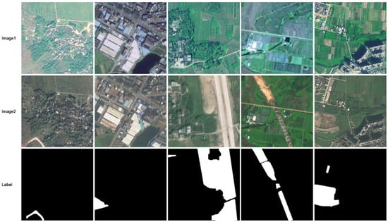 CLCD: The CLCD dataset is a public farmland dataset collected by the Gaofen-2 satellite in 2017 and 2019, as shown in Figure 2. It contains 600 pairs of farmland change samples from Guangdong Province, with a size of 512 × 512 pixels and a spatial resolution ranging from 0.5 m to 2 m. The dataset includes various land types such as buildings, roads, lakes, and bare soil. Each pair of sample images is associated with a binary label indicating farmland change. The samples are divided into training, validation, and test sets in a 6:2:2 ratio, resulting in sizes of 360, 120, and 120, respectively.