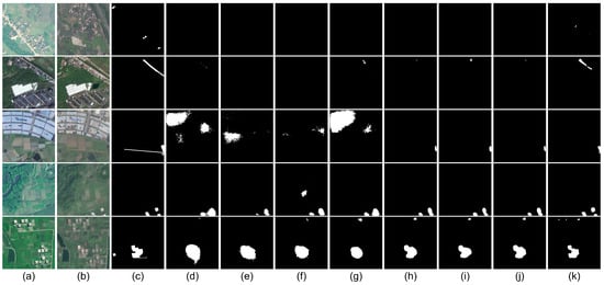 Visualization of experimental results on HRSCD dataset: (a) Image1; (b) Image2; (c) Label; (d) FC-EF; (e) FC-Siam-conc; (f) DTCDSCN; (g) BiT; (h) MFPNet; (i) DSIFN; (j) MSCANet; (k) the proposed method.