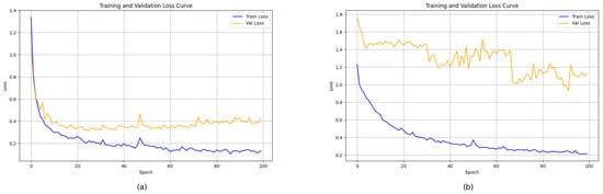 In the loss function experiments, the model demonstrated a consistent decreasing trend in the loss values across both the training and validation sets, as shown in Figure 6, indicating that the model effectively reduced prediction errors during the learning and optimization process. On the CLCD dataset, the loss function stabilized around the 40th epoch, suggesting that the model successfully captured key features related to farmland change and reached a stable state, enabling accurate change detection. This indicates that the model’s performance on this dataset approached an ideal state, exhibiting a strong learning ability and adaptability. On the HRSCD dataset, the loss on the training set stabilized around the 80th epoch. Although the validation set showed an overall downward trend, there were some fluctuations. These fluctuations may be attributed to the complexity of the dataset and the diversity of feature levels. Nonetheless, the overall trend suggests that the model was still able to effectively capture change patterns in the data and gradually converge to a stable state, demonstrating strong generalization capabilities. However, room remains for further optimization, particularly in addressing the fluctuations in the validation set and improving stability.