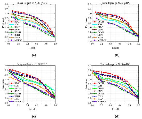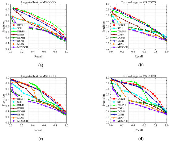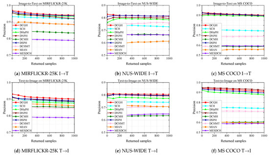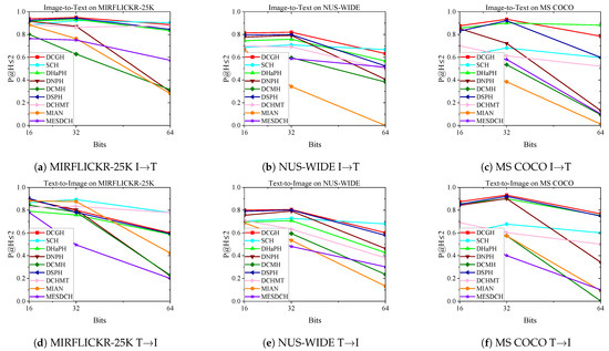 Figure 8d–f show the mAP@H ≤ 2 results for the text retrieval image task. Compared with the state-of-the-art methods in the baseline, our method achieves comparable or even better results.