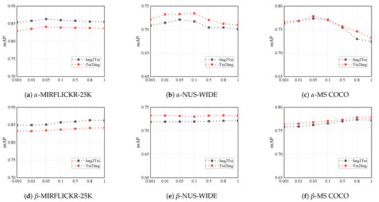 Figure 9a,d, it can be observed that the trend of alpha and beta on the MIRFLICKR-25K dataset is quite intuitive, with the best performance occurring at alpha and beta values of 0.05 and 0.8, respectively.