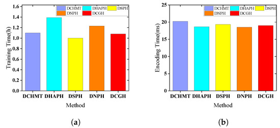To investigate the efficiency of the model, we compared the training time and encoding time of the DCGH algorithm with other Transformer-based cross-modal hashing algorithms on the MIRFLICKR-25K dataset using 32-bit binary codes, with the results shown in