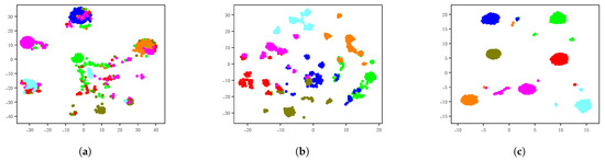 Figure 12; the different colored dots represent different single-label category data. Through comparison and analysis, we can see that our method can obtain higher quality and more intra-class aggregated binary hash codes due to the joint training of the model with proxy loss, pairwise loss, and variance constraint terms.
