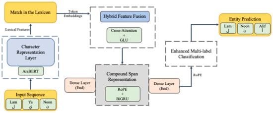 The proposed methodology integrates novel layers, including the Hybrid Feature Fusion Layer, Compound Span Representation Layer, and Enhanced Multi-Label Classification Layer, to address the challenges of Arabic NER. These enhancements enable the model to handle complex linguistic structures, improve lexical integration, and achieve state-of-the-art performance on challenging datasets.