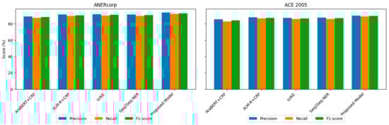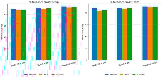 Specifically, Figure 3 presents a comprehensive comparative analysis of the proposed model’s performance relative to both Arabic-specific and generalized state-of-the-art baselines across two datasets: ANERcorp and ACE 2005. The Arabic-specific baselines include AraBERT + CRF and XLM-R + CRF, while the generalized baselines consist of LUKE and Seq2Seq Span-based NER, both of which have demonstrated strong performance across multiple languages. LUKE employs entity-aware attention, making it particularly effective at capturing contextualized entity representations, while Seq2Seq Span-based NER formulates entity recognition as a sequence-to-sequence span generation task, enabling it to effectively handle nested and overlapping entities across languages. Each chart in Figure 3 highlights the model’s superiority in precision, recall, and F1-score, demonstrating its ability to handle both flat and nested entities effectively. On ANERcorp, the proposed model achieves an F1-score of 93.0%, significantly outperforming the best Arabic-specific baseline, XLM-R + CRF, by 2.4 percentage points and surpassing LUKE and Seq2Seq Span-based NER by even larger margins. Similarly, on ACE 2005, which contains complex nested entities, the proposed model achieves an F1-score of 89.6%, surpassing GlobalPointer (the previous state-of-the-art), LUKE, and Seq2Seq Span-based NER, highlighting the effectiveness of the proposed framework in capturing Arabic’s rich morphology and nested structures. These results validate the contributions of our novel components, such as the Hybrid Feature Fusion Layer and Compound Span Representation Layer, confirming the importance of combining Arabic-specific linguistic features with flexible, generalized modeling capabilities. The consistent improvement across both datasets emphasizes the robustness, adaptability, and generalizability of the proposed framework.