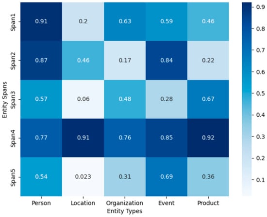 Entity classification heatmap illustrating the alignment scores between spans and entity types. High confidence scores indicate correctly assigned spans, while lower confidence scores highlight misclassified entities.
