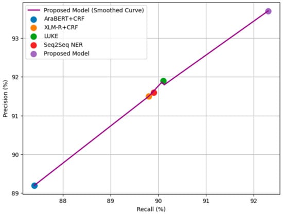 Precision–Recall Curve on the ANERcorp dataset, comparing the proposed model with Arabic-specific and generalized baselines. The proposed model achieves the best balance between precision and recall, demonstrating its robustness in handling both flat and nested entities in Arabic NER.