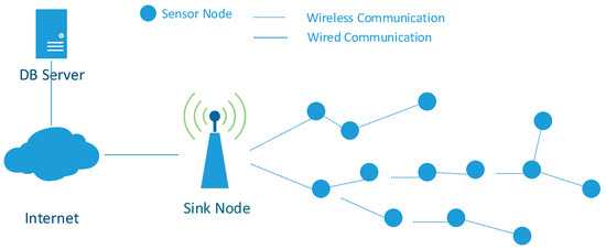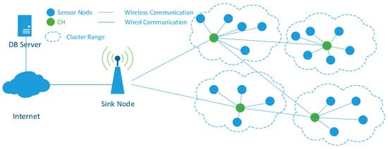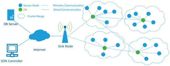 Wireless sensor networks (WSNs) are used widely as a means of monitoring and collecting data from the environment they are deployed in. The small, battery-powered network nodes are capable of sensing, processing, and transmitting data using wireless communication protocols [1]. Normally, the data collected by individual nodes are sent to a sink node or a base station connected to the WSN. From there, the data are transmitted through the Internet to a database (DB) server for further processing and analysis. In general, the communication architecture of a WSN can be flat or hierarchical [2,3]. As shown in Figure 1, in a flat WSN, the networks nodes transmit data to the sink node via multi-hop paths. In a hierarchical (cluster-based) WSN, the network nodes are grouped into clusters; the nodes send data to the cluster head (CH), which then relays the data to the sink node (Figure 2). In addition, a WSN can deploy a software-defined network (SDN) architecture in which the network control plane is separated from the data plane (Figure 3). A software-defined wireless network (SDWSN) supports network scalability and node recycling [4].