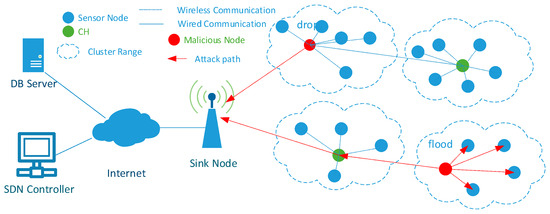 Some typical DoS attacks on sensor networks are described in [6]. While most of them are similar to DoS attacks affecting the Internet, the security solutions for detecting and preventing Internet-based DoS attacks are not always applicable to DoS attacks threatening WSNs. This is due to reasons such as resource and energy constraints, the open nature of wireless communications, and the dynamic topology of WSNs [1,8,9]. In addition, attackers continue to create new DoS attacks that exploit the structural and protocol vulnerabilities of evolving WSNs, including SDWSNs. Bin-Yahya et al. [10] described the most typical threats to SDWSNs as shown in Figure 4. In the ‘flood’ scenario, the malicious node (MLN) sends a large number of packets to its own cluster nodes as well as to the upstream nodes. This consumes the corresponding link bandwidth and node power, negatively affecting network performance. In the ‘drop scenario’, the MLN discards packets passing through it, preventing these packets from reaching the sink node. The data received by the DB server are incomplete, which may negatively affect the data processing output.