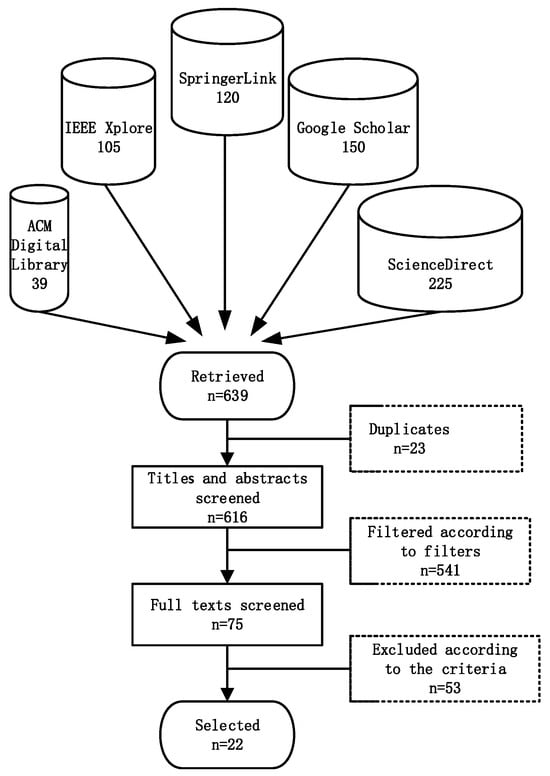 A flowchart of the screening process and selection process is shown in Figure 5. We retrieved a total of 639 relevant documents from the five repositories.