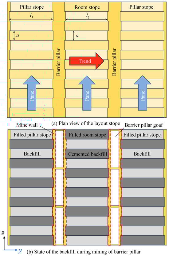 The study area is a mine in China, where direct mining is risky due to the thickness of the ore body and the depth of its burial. The mining method is sublevel open stoping with backfilling. In this operation, the ore body is firstly divided into different panels along the trend; then, a fixed-width barrier pillar is designed between the panels, and the room stopes and pillar stopes are alternately distributed along the panels perpendicular to the ore body trend, as shown in Figure 1. The mining of the ore body is divided into three steps: The first step is to mine the room stopes under the primary support provided by ore pillars on both sides and then backfill the mined stopes using the cemented tailings backfill material. The second step is to mine the pillar stopes under the support of cemented backfills on both sides and then backfill the mine stopes using the full-tailings backfill material. After completing the previous two steps, most of the mineral resources have been recovered. To further improve the recovery of mineral resources, the third step is to mine the panel barrier pillar stopes, and finally backfill the mined area also using the full-tailings backfill material.