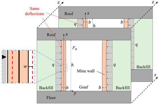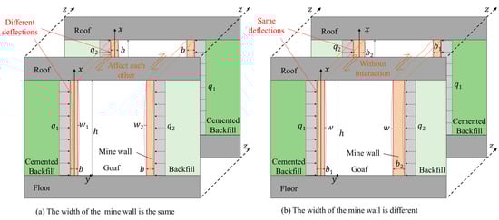 In practice, pillar stopes are mined under the condition that both sides are backfilled at the first mining step, which uses the cemented tailings backfill material, which has sufficient strength to ensure that the backfill will not fail during the mining process of pillar stopes. After the recovery of pillar stopes, to reduce costs, full-tailings backfill instead of cemented tailings materials are used for the backfill. This results in different lateral loads being applied to the thin walls at different locations. Assuming that the lateral loads applied to the wall by cemented and un-cemented backfill materials are q1 and q2, respectively, the two walls of the same barrier pillar stope will have different deflections, as shown in Figure 3a. In this situation, the deformations of thin walls in adjacent barrier pillar stopes will affect each other, so the three-dimensional problem cannot be simplified into a two-dimensional plane problem.