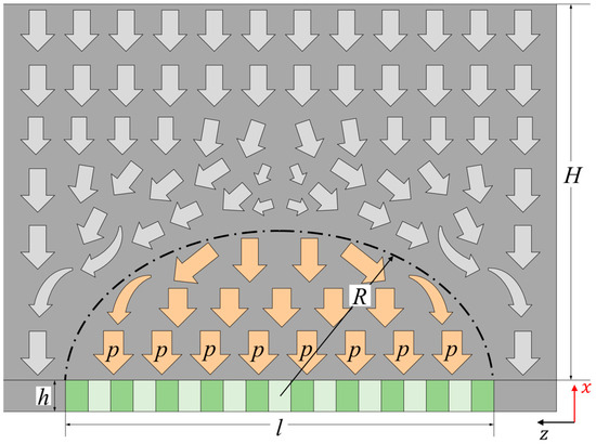 Based on the theory related to natural arches and the findings of our previous studies [29,30], the radius R of the rock mass in the disturbed region surrounding the mine with risk of falling can be determined as: