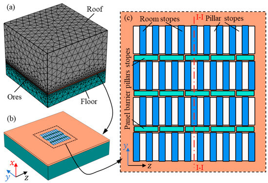 The geological conditions of the mine were simplified, and a 1000 m × 1200 m × 1200 m (x × y × z) numerical model was constructed using COMSOL Multiphysics 6.2 software, as shown in Figure 5a. The thickness of the roof strata in the upper part of the model is 720 m, the thickness of the ore body in the middle part of the model is 25 m, and the thickness of the floor rocks in the bottom part of the model is 255 m. Figure 5b,c illustrate the location of the ore body in the model and the layout of the stopes within the mine, respectively. The model was meshed using free tetrahedral units. Fine mesh was used in the mining area to ensure the accuracy of the model while coarse mesh was used in areas far away from the stopes to reduce the computational cost, resulting in a total of 640,207 elements. The minimum cell mass is 0.278, the average cell mass is 0.721, and the cell volume ratio is 2.43 × 10−4, giving the mesh a high overall mass. In this case, the Drucker–Prager criterion was used. This criterion is a modified version of the Mohr–Coulomb criterion, retaining the ability to use the Mohr–Coulomb parameters while avoiding the problem of sharp corners that tend to occur in the principal stress space when the Mohr–Coulomb criterion is used. The parameters used in the simulations are listed in Table 1. As the model is large and the excavated area is located in the center of the model, far from the boundary, it can be assumed that there is no displacement at the bottom and only vertical displacement around the surrounding area. The following boundary conditions were used: fixed constraints on the bottom surface of the model, fixed displacement constraints in the normal directions of the four side surfaces of the model, and no constraint for the top surface of the model. Only gravitational loads were considered. The model is the result of a simplification of the actual mine, and in the simulation calculations, it is assumed that all material properties are homogeneous and isotropic, ignoring the anisotropy of materials in the actual geological environment. Moreover, the boundaries are set to be fixed or free, which may deviate from the actual situation. The current model is mainly applicable to laminated rock structures. For geological environments that are unstratified, highly fractured, or where there are a large number of faults, the predictive power of the model may be reduced.