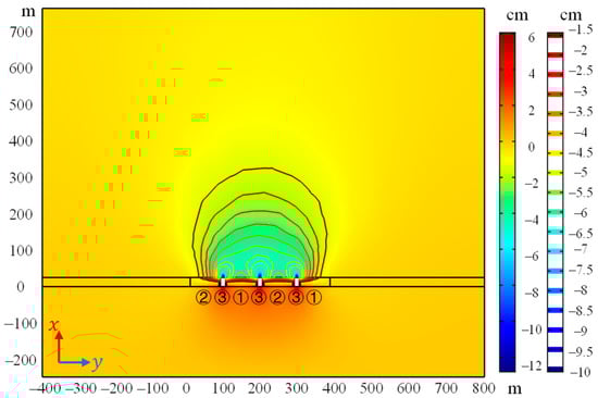 The simulation was conducted according to the three-step mining processes. Figure 6 shows the contour plot of the vertical displacement in cross-section I-I (Figure 5) after the mining of the barrier pillar stopes is completed. The maximum displacement is found to be about 12 cm at the roof of the panel barrier pillar stope. The backfill materials of room stopes and pillar stopes play a partial bearing role and restrict the roof displacement, so the displacement at these locations is about 3 cm. The contour map of the vertical displacements shows a dome structure, which is in general agreement with the assumptions of a caved natural arch formed at the top of the excavation.
