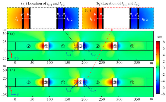 In this study, simulations were run for both equal-width and non-equal-width thin walls. For the first case, the room stopes and pillar stopes were set to the same size, and the width of the thin walls was set at 3.25 m, as shown in Figure 7a. As different backfill materials were used in the room stopes and pillar stopes, the horizontal displacement of the thin wall near the pillar stope is greater than that near the room stope, which is expected. For the case when the width of the thin walls is different, at 2.5 m and 4 m, respectively, the results are shown in Figure 7b. Compared with Figure 7a, the horizontal displacement of the thin wall close to the room stopes becomes much larger, while the horizontal displacement of the wall close to the pillar stope is slightly reduced.