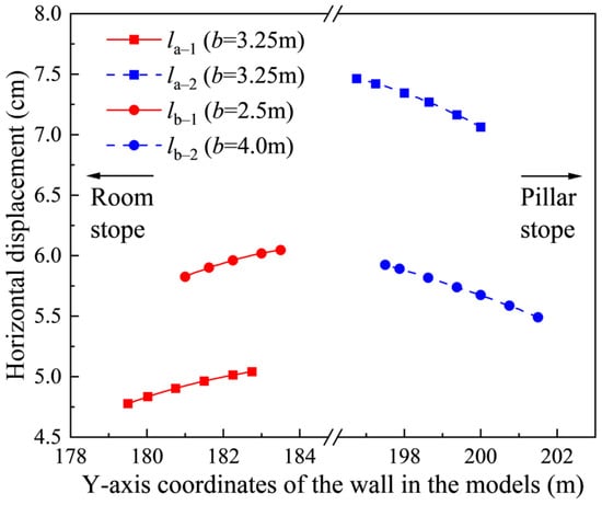 To have a better understanding of the horizontal displacement of the thin wall, the horizontal displacement in the middle of the thin walls from different stopes was extracted and is plotted in Figure 8. la−1, la−2, lb−1, and lb−2 are the four segments, as shown in Figure 7, and their corresponding simulation results are listed in Table 2. When the width of the thin wall is 3.25 m, the average horizontal displacement of the wall close to the room stope is 4.92 cm, while the average horizontal displacement of the wall close to the pillar stope is 7.28 cm. The horizontal displacement of the wall close to the room stopes is only 67.6% of that close to the pillar stopes. In other words, the wall close to the pillar stopes may be damaged first, leading to stress concentration in the walls close to the room stopes which may be subsequently damaged. If the width of the wall was reduced to 2.5 m near the room stopes and increased to 4 m near the pillar stopes, it could be found that the average horizontal displacement of the wall increased to 5.96 cm for the 2.5 m wall and decreased to 5.72 cm for the 4 m wall. In this case, the horizontal displacements of both walls are approximately equal. In other words, the deformations of both walls were relatively more coordinated, and the risk of partial failure and overall collapse was reduced.