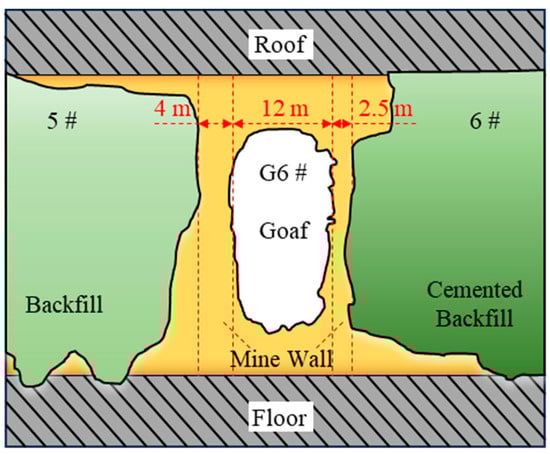 The scan results shown in Figure 9 indicate that the width of the retained walls is in good agreement with the design value without significant over-break or under-break. The scanning confirmed that both walls remain in good integrity with no significant peeling or cracking identified. No large quantities of backfill materials were found to have entered the stope during the mining process, and the walls performed well in isolating the backfill from the stopes. In addition, BGK-A3 multi-point displacement gauges were installed on the roof of the barrier pillar stopes to monitor the roof displacements. After 6 months of monitoring, the maximum displacements were 34 mm at the monitoring points in the G6 goaf. It is worth explaining that the maximum displacement monitored by numerical simulation is 12 cm, which is 3.5 times that of the on-site monitoring result, and there is some error. The main reason for this phenomenon is that the on-site monitoring results only represent the maximum displacement near the monitoring point, and do not represent the maximum displacement of the whole roof, so the maximum displacement of the roof on-site will be greater than 34 mm. In addition, the simulation parameters are the average of the rock tests at several sampling points, which may have some differences with the rock at the location of the monitoring point. Also, the simulation process simplifies the strata, and other reasons can lead to these errors. Although there was some error in the modeling and monitoring results, these displacements were within the safe range, proving that the backfill in this case had provided sufficient additional support to the roof strata. The results demonstrated that the backfill, in this case, worked well, the thin wall did not appear to have large deformations or damages, the theoretical and numerical simulation results agreed well, and the layout of non-equal-width walls had a great application value in this type of mining operation.