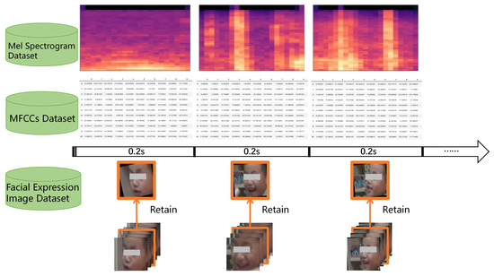 Facial emotions can be inferred from facial activity units in a single frame of an image; however, split-frame speech data are too short and insufficient to discern the emotion conveyed therein. In the field of speech signal processing, the signal features of speech are widely accepted to remain essentially in a quasi-steady state over a short time span. Given these features, the study matches the modal timing with the identical time principle, using Adobe Premiere Pro CC 2017 (version 11.0) to separate the sound and picture from the recorded video to obtain the time-synchronized silent video and audio files, and then divide the video and audio files into several 0.2-s segments, as shown in Figure 1.