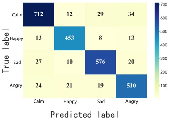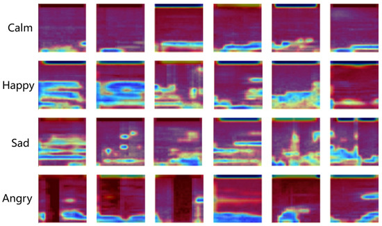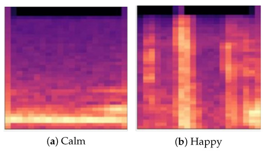 Comparative analysis of Mel spectrograms from speech samples of children with autism across emotional states revealed discriminative patterns, as shown in Figure 2. In happy emotional states, higher energy values were observed in high-frequency regions, whereas in calm states, energy remained predominantly concentrated in low-frequency domains. These distinct spectral patterns validate the effectiveness of Mel spectrograms in representing speech features across different emotional states in children with autism. Future research could investigate additional time–frequency representations to potentially enhance emotion recognition performance.