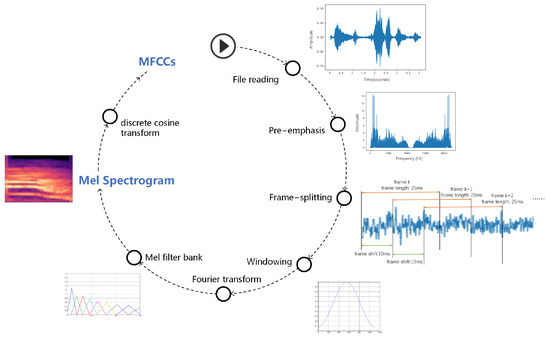 The generation of the Mel spectrograms and MFCCs is illustrated in Figure 3. The original audio file was subjected to sequential pre-emphasis, frame splitting, windowing, Fourier transformation, and Mel filter bank operations to produce Mel spectrograms. Finally, a discrete cosine transform operation was applied to generate MFCCs. In accordance with the preceding steps, 667 audio segments collected from the filming process were submitted to the speech feature extraction process. After manual screening, the final numbers of Mel spectrograms and MFCCs were 24,793 and 942,134, respectively.