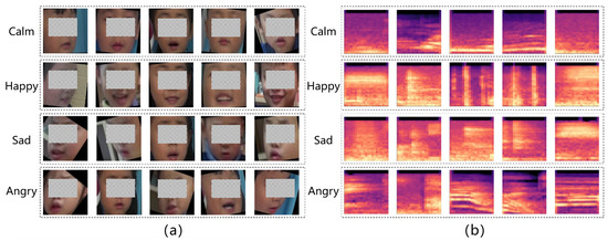 Existing research on the emotions of children with autism primarily focuses on comparing the emotion recognition abilities of children with autism with those of typically developing children. There is little research on the external emotional expressions and internal emotional activities of individual children with autism. In typically developing children’s learning affective computing domain, many studies have tracked the changes in individual learning emotions [4,5]. These studies involve creating datasets of children’s emotions and employing deep learning technology to construct models for recognizing emotions [6], thereby enabling the intelligent detection of children’s learning emotions. However, compared with those of typically developing children, the facial muscle movements of children with autism are different [7], and their facial expressions exhibit asynchrony [8] and a lower complexity [9]. These findings lead to the assumption that affective computing models and datasets for the general population cannot be directly adapted and applied to this special group of children. In addition, the language development ability of children with ASD, who have fewer verbal expressions and more emotional elements in their speech, lags behind that of typically developing children. For example, special pronunciations such as “babbling” and “growling” contain negative emotions. Therefore, the speech modality can be used as a key reference for emotion recognition of children with ASD.