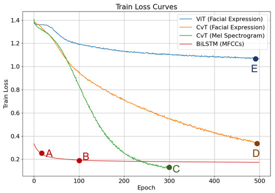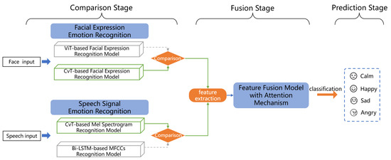 The comparison stage uses single-modal data to conduct model experiments. (1) Emotion recognition based on facial expression involves comparing the performance of two models with different structures, i.e., ViT and CvT, and selecting the best one as the facial expression feature extraction network in the following stage. (2) The purpose of emotion recognition using speech signals is to determine which representation between MFCCs and the Mel spectrogram is more effective for model training. Our study employs the Bi-LSTM model for processing MFCCs and the CvT model for processing the Mel spectrogram.