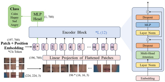 The ViT (Figure 6) model is one of the models used in this study to classify facial expression images, and it is the first application of a transformer architecture in the field of computer vision. ViT converts images into sequential tokens that can be processed by the transformer structure through patching operations, and it is an image classification model based entirely on the self-attention mechanism. In image classification tasks with large datasets, ViT achieves better performance than CNN.