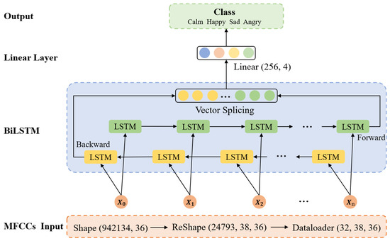 In this study the Bi-LSTM model is employed for the classification of MFCCs, which consists of two LSTM networks, namely a forward LSTM and a backward LSTM. The forward LSTM processes the input sequence using a front-to-back time step, whereas the backward LSTM does the opposite. In each time step, Bi-LSTM utilizes both preceding and subsequent information to enhance its modeling of the sequential data. The inference process of the model is shown in Figure 8. The dataset is normalized and transformed into 3D vectors required for the model and then fed into the dataloader as input to the network in the shape of (32, 38, 36). The number of network layers is set to two, the number of hidden neurons is 256, and the time step seq_len is 38. The data are input into the forward and backward LSTM and then vector splicing is performed, finally outputting the classification results after the linear layer.