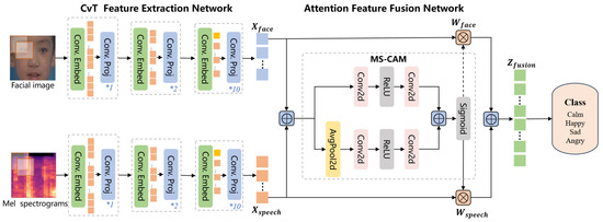 In the fusion stage, the previously screened model is used as a feature extraction network to process the input data. A new batch of facial expression and Mel spectrogram image data is processed into two feature vectors, and they are then fed into the feature fusion model based on the attention mechanism, which automatically calculates the weight values and fuses the significant features.