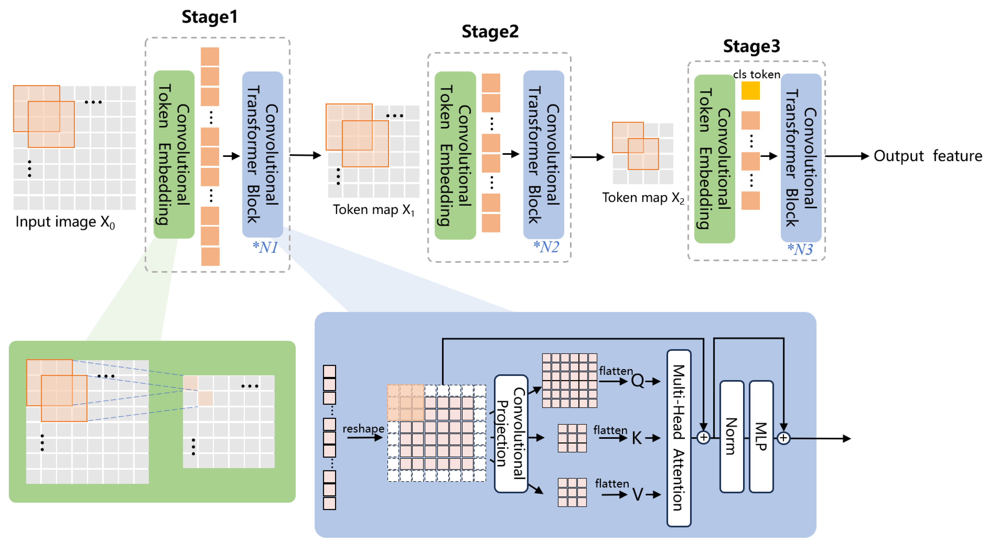 CvT model structure. The asterisks (*) in the image represent the number of transformer blocks in each stage: *N1, *N2, and *N3 indicate the number of transformer blocks in Stage1, Stage2, and Stage3, respectively.