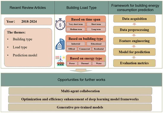 The work of this paper systematically integrates the latest progress of deep-learning-based building energy consumption prediction methods, breaking through the limitations of only focusing on traditional machine learning algorithms in the past. Through an in-depth analysis of the multi-dimensional building load classification system, it is possible to more accurately grasp the characteristics of building energy consumption in different scenarios, providing a solid foundation for the subsequent construction of data-driven models. In addition, taking the prediction steps as the main line, a comprehensive and scientific data-driven energy consumption prediction framework is innovatively established, elaborating on the cutting-edge technologies and methods in each link from data collection to model validation. This provides a new perspective and operation guide for future research, helping to improve the accuracy and reliability of building energy consumption prediction and contributing to the building industry’s achievement of more efficient energy management and energy conservation and emission reduction goals. The main structure of this paper is shown in Figure 1. The paper is organized as follows.