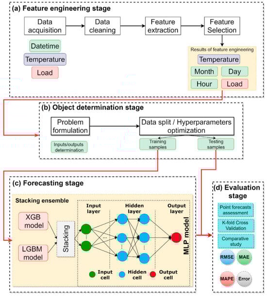 The short-term prediction of building energy consumption is closely linked to the daily operations of various service systems [46,47], playing a crucial role in reducing the uncertainty associated with future building operations [48]. This not only assists building managers in developing more cost-effective energy-saving strategies but also enables the optimization of building energy management and the enhancement of environmental sustainability [49]. Additionally, short-term building energy consumption prediction plays a pivotal role in driving the development of model-based predictive control, fault detection, and diagnostic methods. Currently, the prediction of short-term heating loads [50,51], cooling loads [52,53,54], and power loads [55,56,57] is a particularly hot topic of research. As illustrated in Figure 3, a stacking ensemble framework for short-term load forecasting is proposed [58]. The framework encompasses feature engineering, object determination, forecasting, and an evolution stage. It utilizes a stacking strategy to predict short-term dynamic changes in building loads.