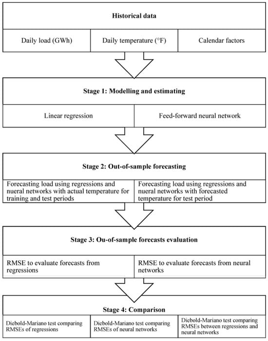 With the continuous growth of energy demand, there is an increasingly urgent need for accurate and powerful demand predictions, which is crucial for formulating effective medium-term strategies and controlling energy usage in the construction sector [61]. However, compared with short-term load forecasting, medium-term forecasting has received relatively less attention [62]. Medium-term power load forecasting not only provides theoretical support for the reasonable maintenance of grid equipment but also plays a key role in the stable and efficient operation of the power system, generator shutdown planning, and supply and demand management [63]. The results of medium-term load forecasting can provide weekly fluctuation information, which plays an important role in planning energy maintenance, agreeing on energy matching mechanisms, and formulating energy strategies, thereby contributing to the optimization of energy system planning and scheduling [64]. Correct load forecasting can not only improve the utilization rate and reliability of electricity but also ensure that the energy system network responds quickly and fully meets user needs [65]. Bashiri Behmiri et al. [66] proposed a medium-term load forecasting method based on time-series regressions and neural networks, which takes into account the future weather sequence and improves the accuracy of the medium-term forecasting model. The basic framework of the forecasting method they proposed is shown in Figure 4. In addition, medium-term forecasting also provides valuable supporting information for system operation, maintenance planning, and long-term contract negotiations [67,68].