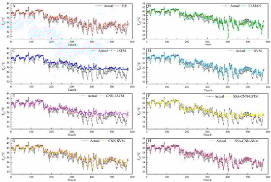 Example of predicting long-term loads using different models. Among them, (A) uses a BP neural network, (B) uses an ELMAN network, (C) uses an LSTM network, (D) uses an SVM, (E) uses a CNN-LSTM model, (F) uses an SSA-CNN-LSTM model, (G) uses a CNN-SVM model, and (H) uses an SSA-CNN-SVM model [75].