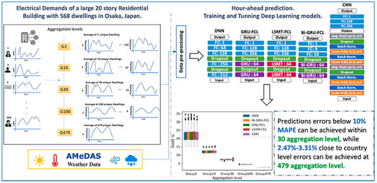- Shaqour, A.; Ono, T.; Hagishima, A.; Farzaneh, H. Electrical demand aggregation effects on the performance of deep learning-based short-term load forecasting of a residential building. Energy AI 2022, 8, 100141. [Google Scholar] [CrossRef]
