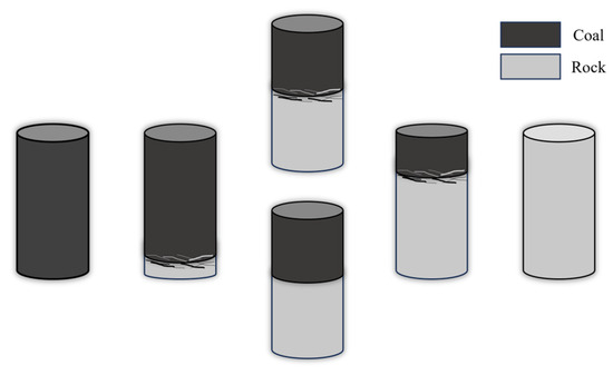Samples of dimensions d50 mm × h100 mm were prepared, including single-coal samples; single-rock samples; and primary coal–rock combinations with coal–rock ratios of 3:7, 5:5, and 9:1 (referred to as primary coal–rock combinations in this study). Additionally, artificial coal–rock composite specimens were created by naturally joining d50 mm × h50 mm coal and rock samples to form d50 mm × h100 mm composite bodies (referred to as artificial coal–rock composite specimens in this study). Figure 1 illustrates a schematic diagram of the specimens.