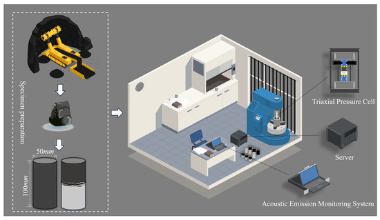 This study utilized the RLW-500G coal–rock triaxial testing system to conduct uniaxial loading tests on samples. The maximum axial loading pressure of the equipment is 500 KN. The acoustic emission testing equipment used was the PCI-2 acoustic emission test analysis system manufactured by Physical Acoustics Corporation of the United States, with a sampling frequency of 5000 KHz and a threshold of 46 dB (Figure 2). Six groups of samples were prepared. Combined with the acoustic emission system, uniaxial compression tests on samples were conducted to reveal the deformation and failure characteristics, as well as the response laws, of coal–rock composite samples with different coal–rock ratios. This is aimed at providing a certain research basis for the prevention and control of dynamic disasters in deep coal mining. The samples (raw coal–C, rock–R, artificial coal–rock combination–CR, primary coal–rock combination–CSR) were set with five different coal–rock ratios, namely, 10:0, 0:10, 5:5, 3:7, and 9:1.