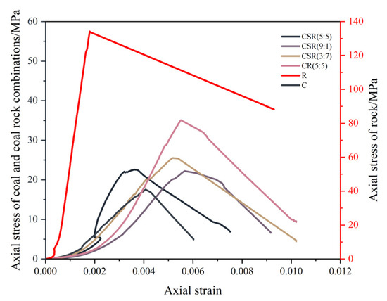 Stress–strain curves of single-rock sample, single-coal sample, and combinations.